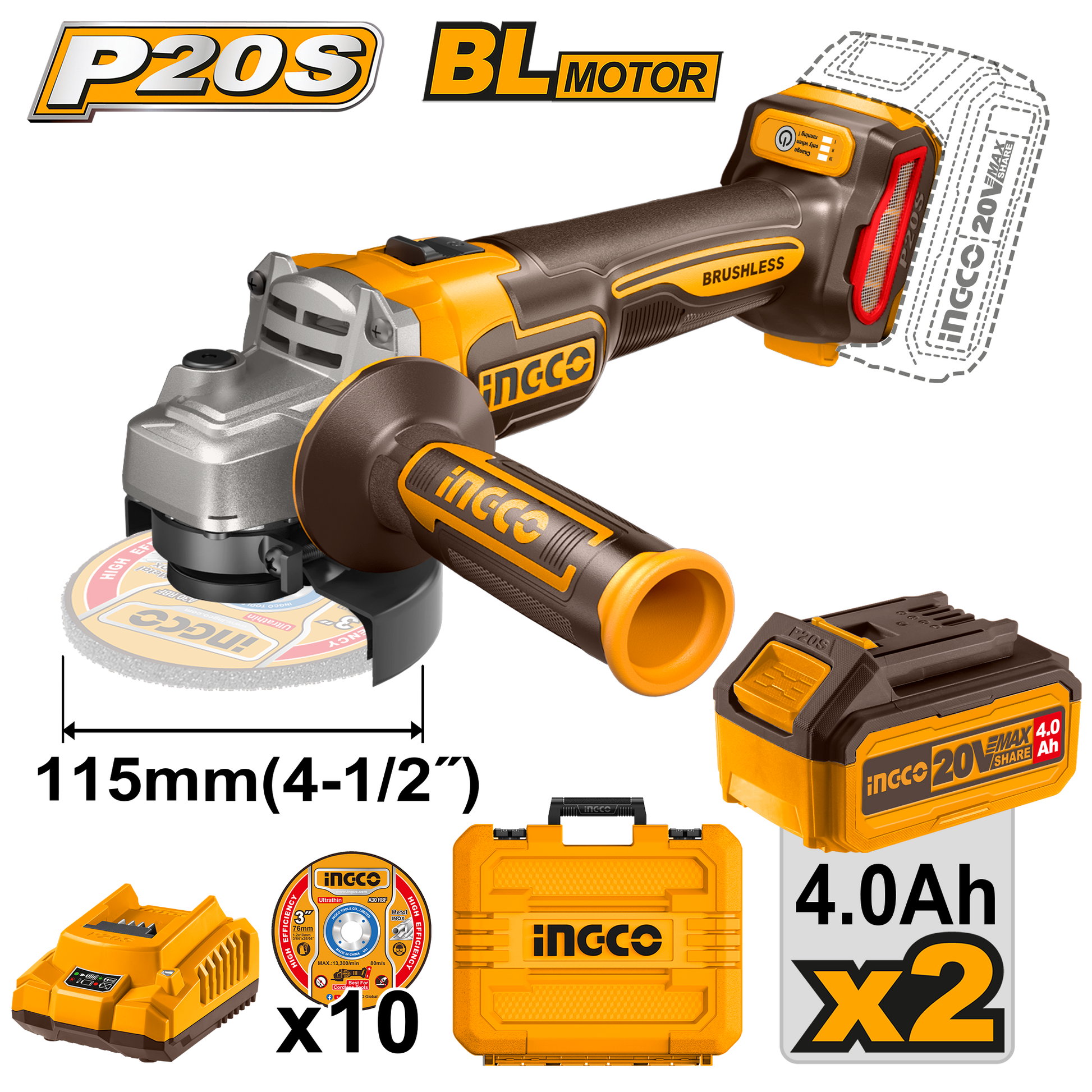 Ingco Cordless Grinder 115mm 20V Brushless Kit